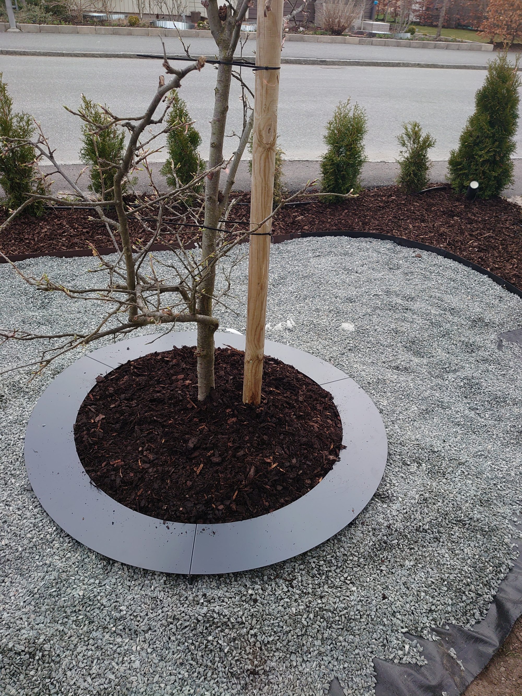 På tomten finns två träd – ett plommonträd och ett körsbärsträd. För att få en snygg och harmonisk övergång mellan träden och stenytan valde vi att montera dekorativa trädringar. Vi använde färgen Mörk Grafit, men ringarna finns även i Zink och Corten (rostfärg) för den som vill ha ett annat uttryck.
